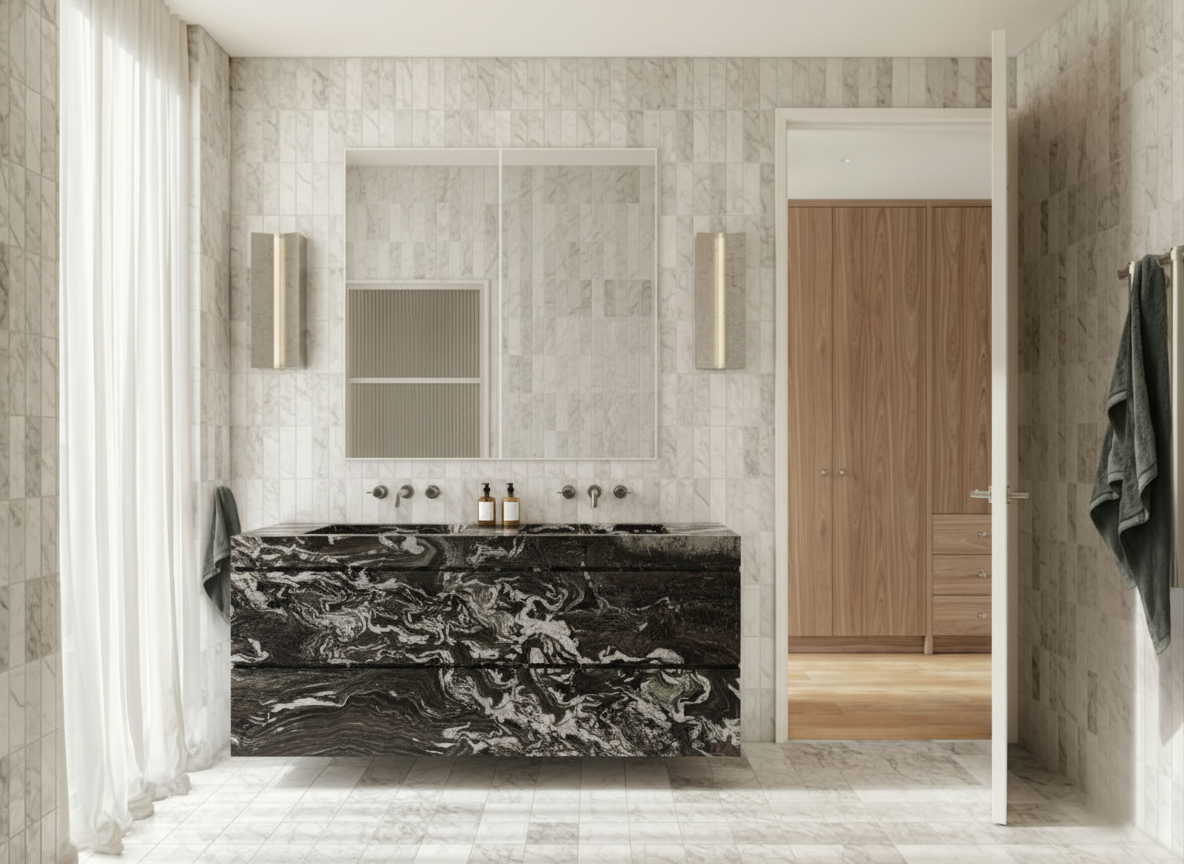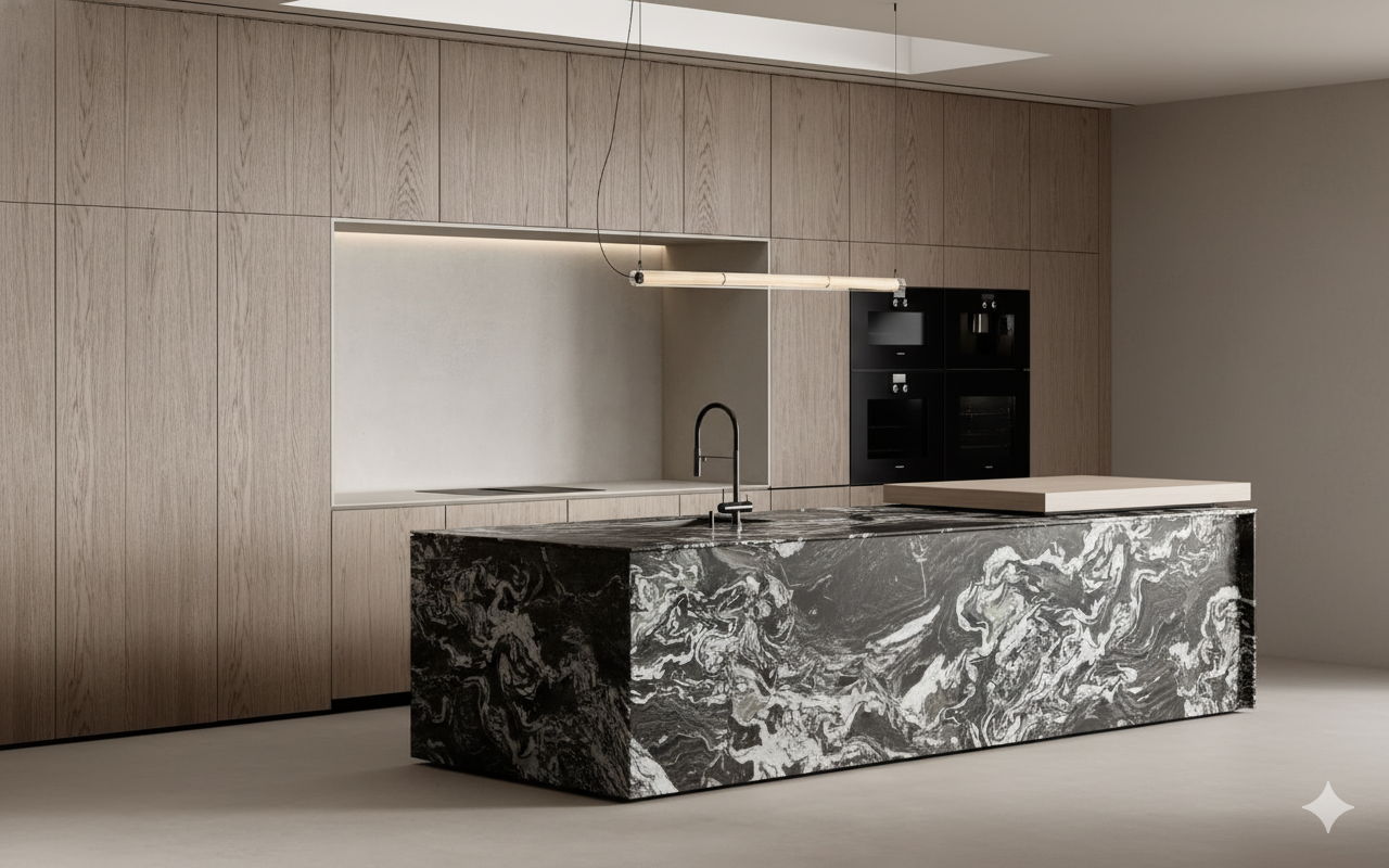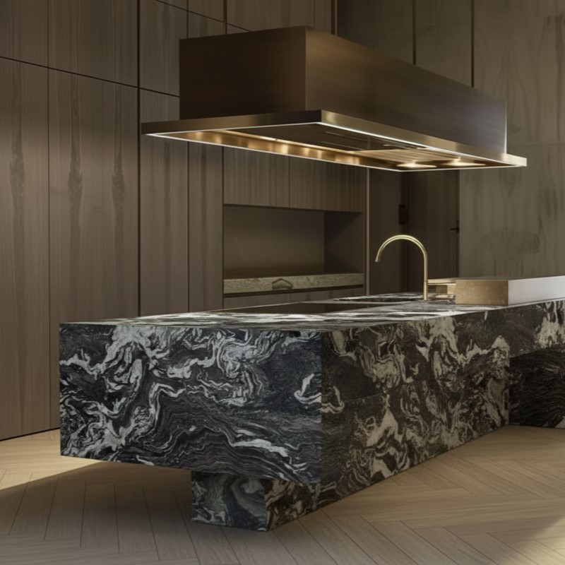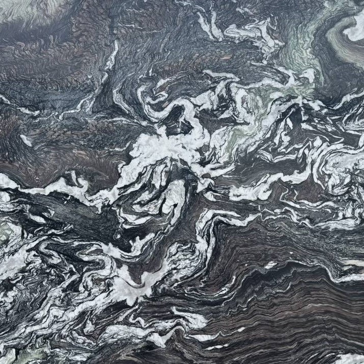 หินอ่อนรอสโซ่ ลูอาน่า Rosso Luana หินอ่อนแท้นำเข้าจากต่างประเทศ หินอ่อนสีดำ ริ้วคลื่นขนาดใหญ่สีขาว ปนเขียวทั่วแผ่นหิน ดูพริ้วไหว เป็นเอกลักษณ์และสะดุดตา ให้ความหรูหรา สวยงาม แต่แฝงความดุดัน เหมาะติดตั้งภายใน เน้นจุดที่ต้องการให้การตกแต่งดูโดดเด่น เช่น เคาน์เตอร์ ผนังหลังทีวี หรือห้องน้ำโซนแห้ง